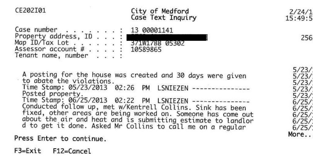 “I spoke with the resident at 2762 Crater Lake Hwy. (sic) recently,” Niezen wrote in a letter to an RPG attorney. “She informed me that the violations at the property have not been resolved … Specifically the following issues need to be resolved: Forced air/heat is inoperative … Electrical circuit in supplying the living room is faulty. Multiple plumbing leaks.”